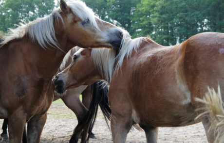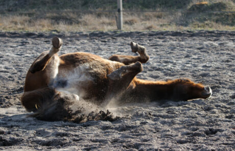 Deshalb gibt es bei uns zwei Herden für unterschiedliche Bedürfnisse. Beide Herden leben in Paddocktrails mit ständig zugänglichem Laufstall, genügend Futterplätzen, damit jedes Pferd in Ruhe fressen kann, verschiedenen Liegeflächen und Knabberhecken. Die Ausläufe und Ställe werden täglich gesäubert.